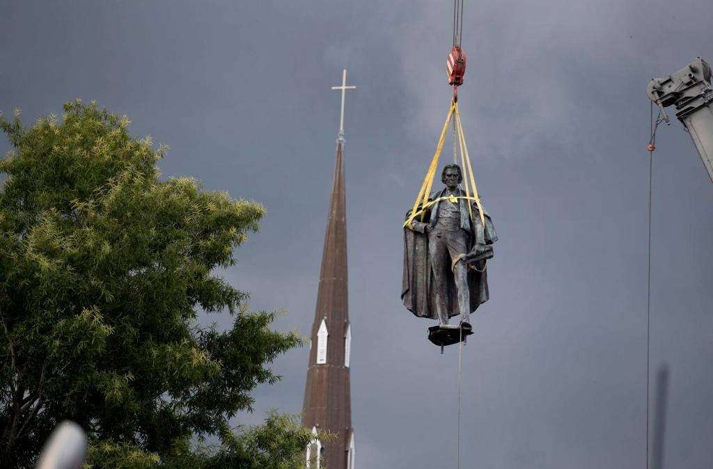 Image source: Alford, Grace Beahm. The John C. Calhoun statue is lowered from its perch in Marion Square Wednesday, June 24, 2020, in Charleston. 2020. Photograph. https://www.postandcourier.com/politics/calhoun-statue-not-protected-by-sc-monument-law-deemed-constitutional-by-state-ag/article_94a836f0-b72a-11ea-8d9d-6b4c118135de.html.